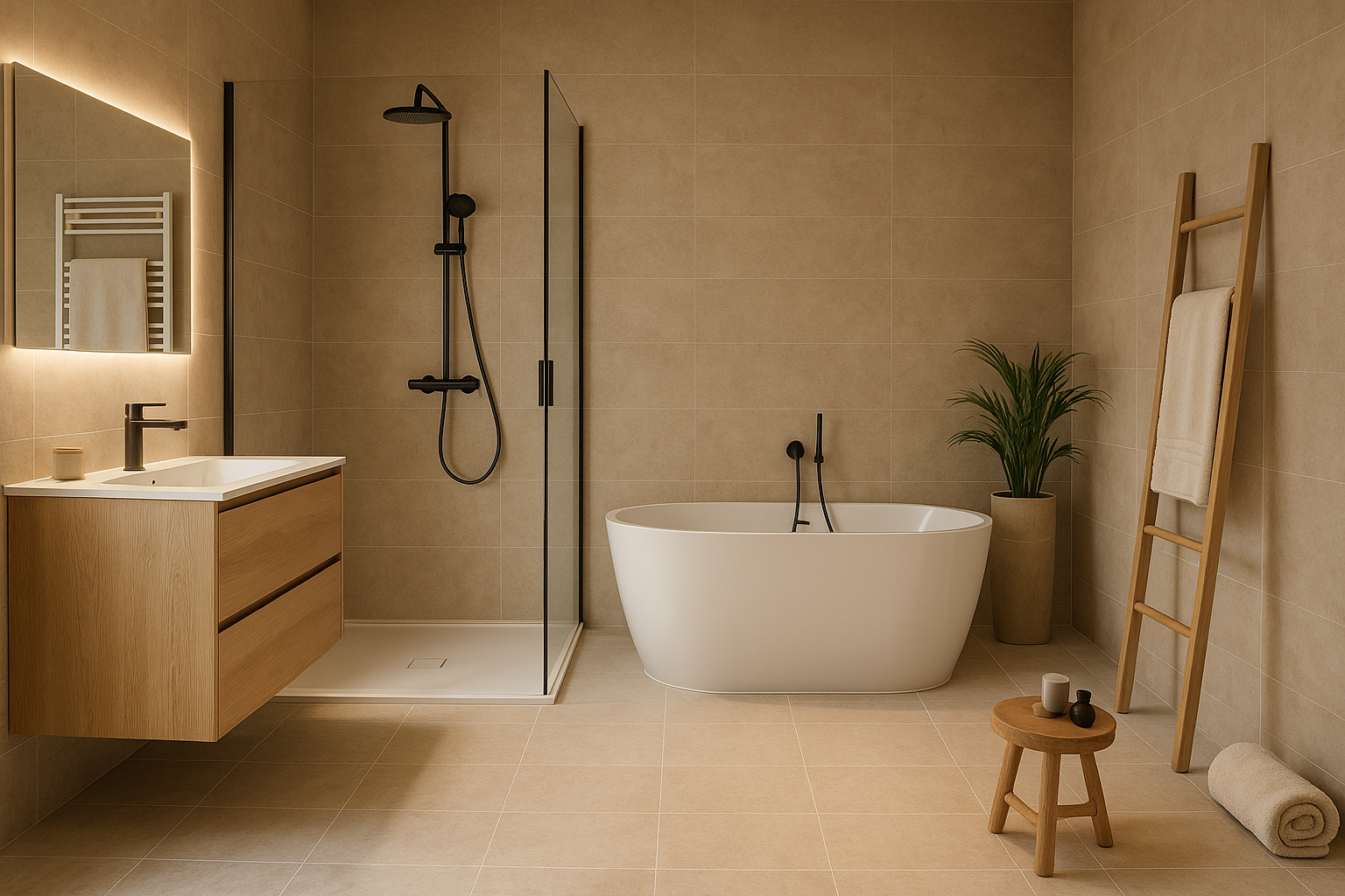 - Tiras LED en zonas estratégicas (ducha, mueble, nichos)