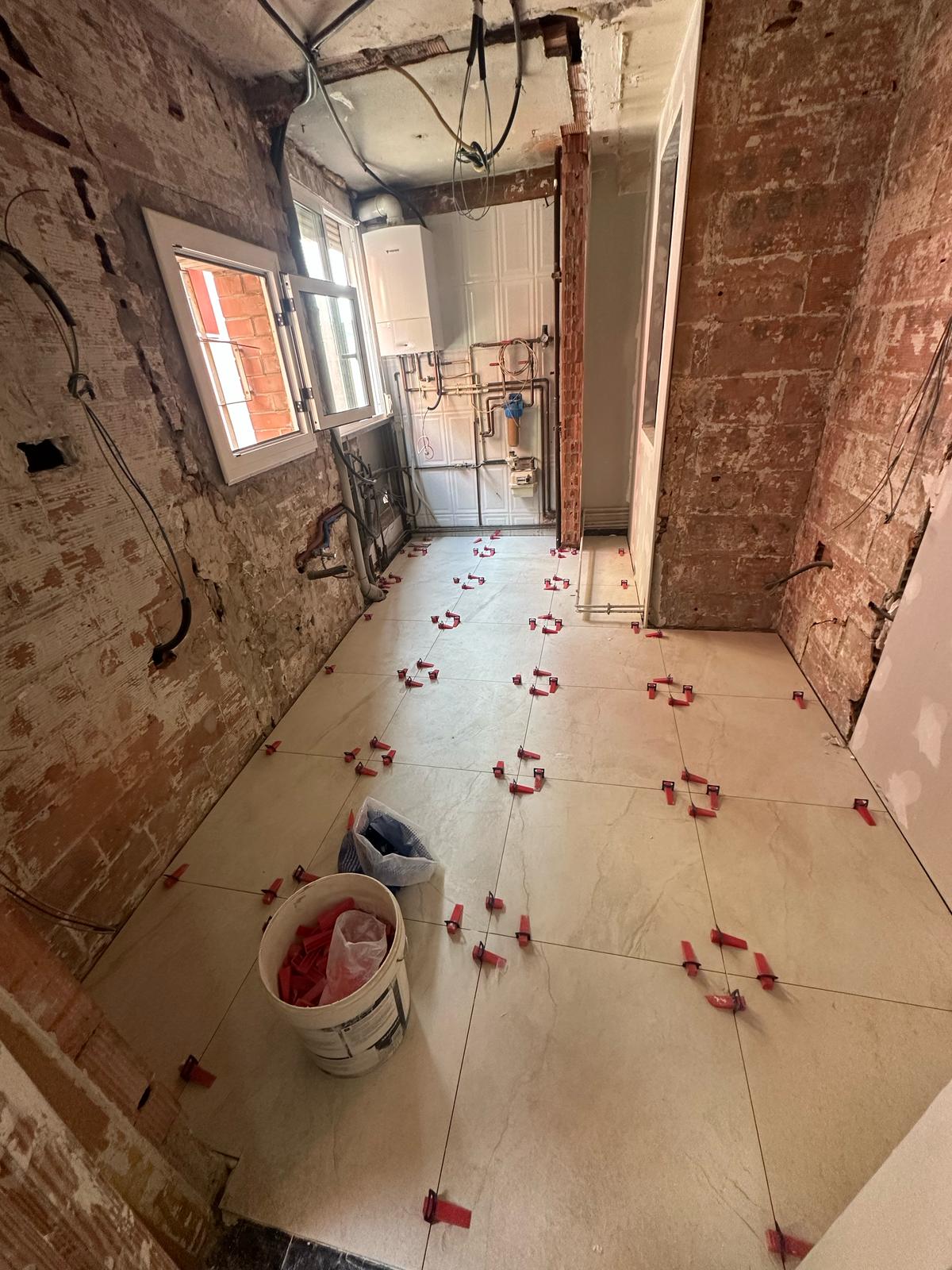 Reforma integral en Cornellá de Llobregat. Instalación de parquet laminado, puertas lacadas, mobiliario de cocina a medida, encimera de Neolith…